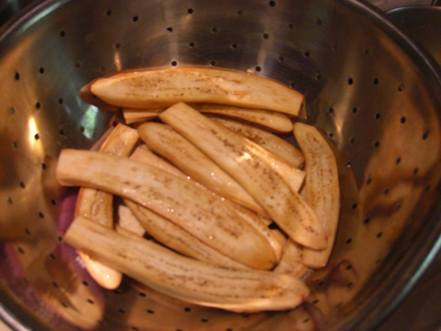 It’s not a weeknight dish because it takes time at least three hours to prepare. But most of that is waiting, and the steps are all pretty easy. It also freezes really well. You can use either Asian or globe eggplants. I’ve only done it with Asian, though, because that’s what comes in my bag.