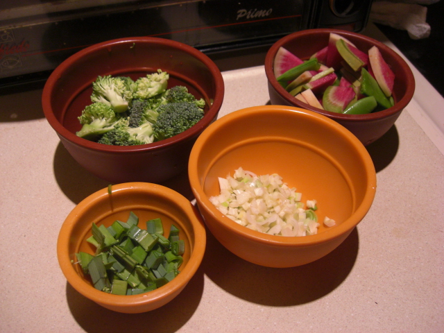 green onions, broccoli florets, watermelon radish, and onions and garlic
