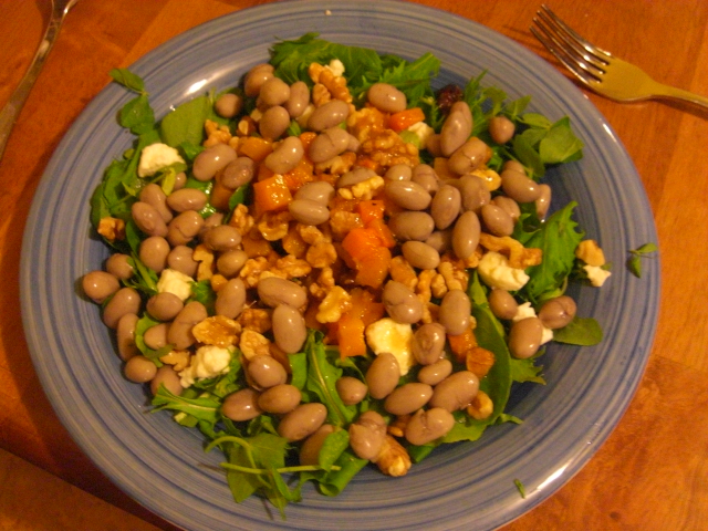 Our contributions to Thanksgiving were sweet potato pie and the butternut squash arugula salad that Natalie recommended. I pretty much followed the salad recipe except for using goat cheese instead of Parmesan and adding some pea shoots. It’s a great recipe. It has lots of pretty colors, and it’s fun to assemble all the pieces. I didn’t take any pictures at Thanksgiving, but Chris and I had a reprise of the salad with mixed Asian greens a few days later. (And by the way, those Asian greens had been sitting in my crisper for a while and they were still crisp and tasty.)
