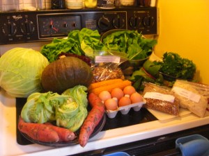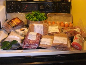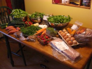 There’s awesome stuff in here for salads. (We’ve already had two and are looking forward to more.) We got two basic types of salad greens: delicate hydroponic lettuce and mixed greens. (The mixed greens can also be braised or stir-fried, but we like them best as spicy salad.) I try to use the hydroponic stuff first because it won’t last as long as the mixed greens. This type of lettuce is one of the things that makes converts to local food. It would never last long enough to be sold in a store, but the flavor and texture is far superior when you can get it fresh.