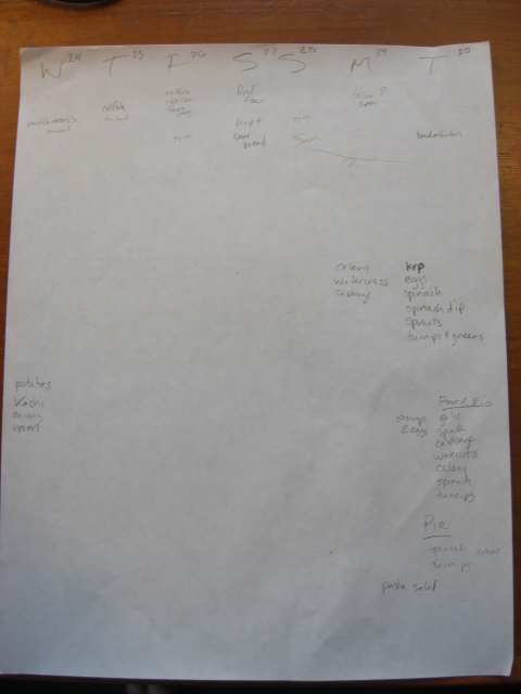 After I’ve put the produce away, I sit down and make my little weekly planning sheet. (Sometimes, this part won’t happen until Thursday or Friday.) Here’s a bad picture of one.