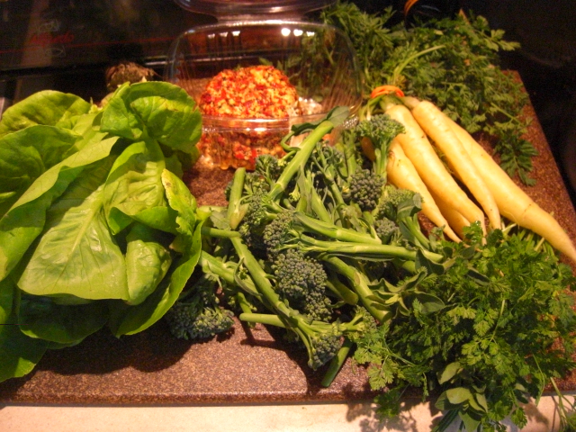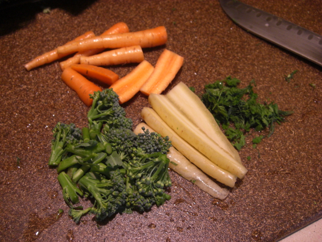 I steamed the broccoli, a white carrot, and some onions and then topped them with some chervil and dill. Pretty yummy except the onions were too strong.