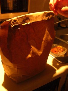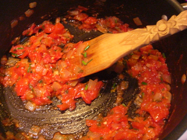 I’ve made a couple of meals so far with my stuff. Wednesday’s supper was chopped up Roma tomatoes from last week cooked with garlic, onion, olive oil, chives, and oregano.