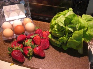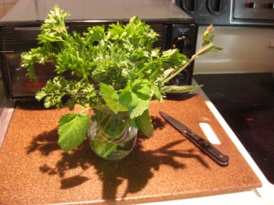 The lettuce, spinach, herbs, tomatoes and green onions have to be eaten, so this week’s going to be all about salad, too. Lettuce, spinach, tomatoes, and chilled beet slices. I’ve roasted the beets, and they’re now chilling in the fridge for tonight’s salad. Not sure if we’ll make it through all the spinach before Saturday, but we’ll try.