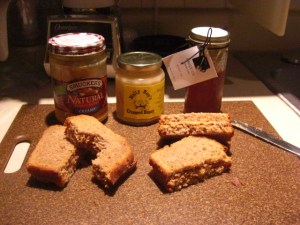 Yesterday we had an afternoon peanut butter sandwich snack attack. I had mine with creamed honey, and Chris had Emily G.’s apple pie jam. Both were on delicious, dense whole wheat bread from a CSA delivery several weeks ago. I froze it when we got it and then defrosted it a while back. Worked great.