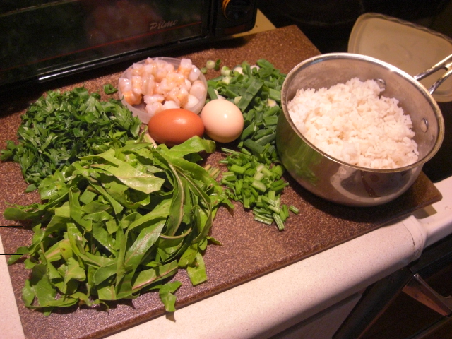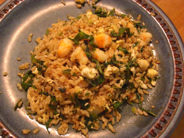 Yesterday I made fried rice with beet greens, par-cel leaves and stems, green onions, eggs, shrimp, and rice.