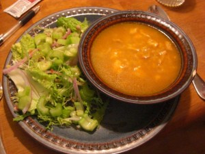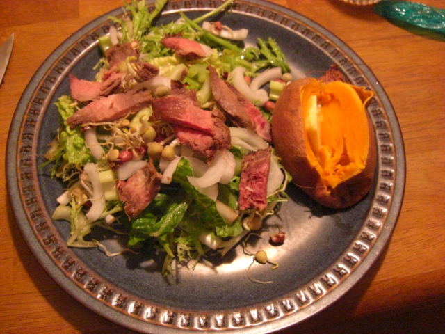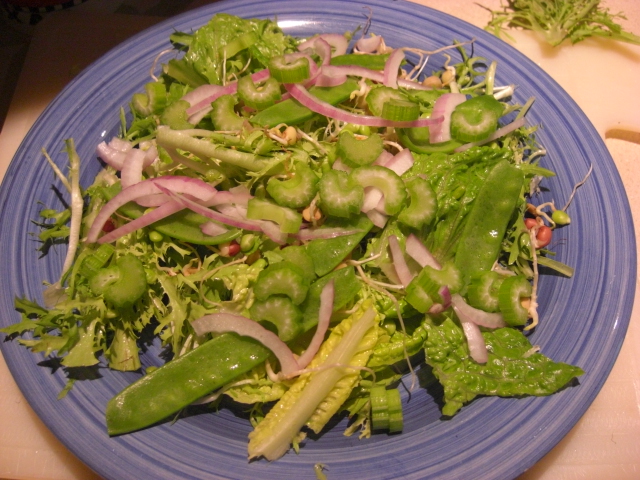Big ol’ salad with frisee, peapods, sprouts, and celery from Farmers’ Fresh and some romaine and red onion from Kroger