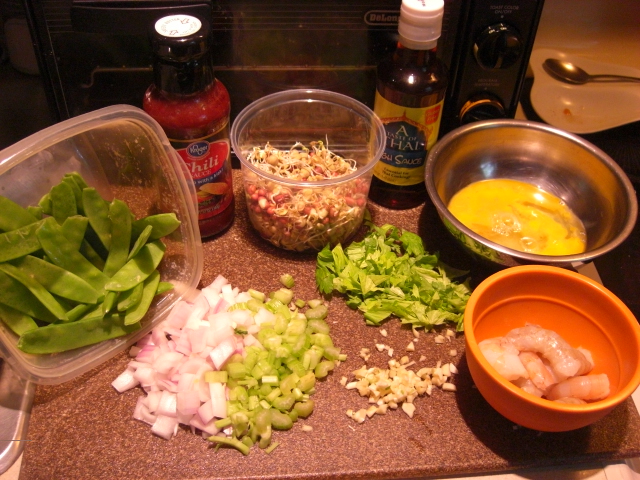 Pad Thai ingredients: celery and red onion, pea pods, chili sauce, bean sprouts, fish sauce, 2 beaten eggs, half a dozen shrimp, minced garlic, chopped celery leaves