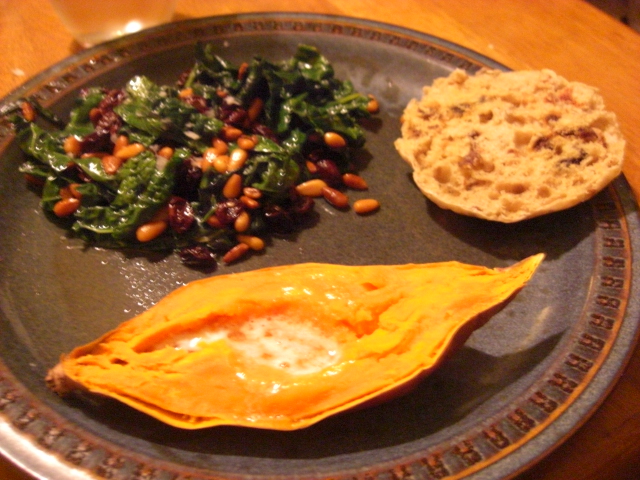 Tuscan kale with raisins and pine nuts and half a sweet potato and half an English muffin - very quick and easy