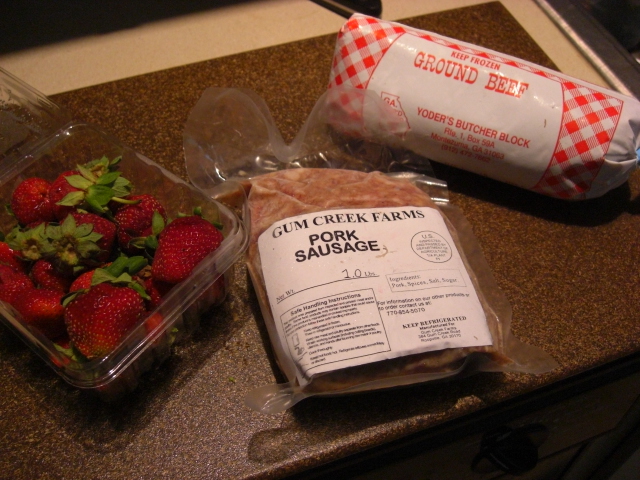 The onion bulbs I’ll store in a wire basket. Hopefully they’ll last a good long time. It’s so nice to have local onions. Which reminds me that Chris asked for burgers this week. That’s why I ordered ground beef from the online store along with sausage and extra strawberries.