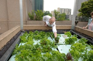 Two floors up from the Park 75 kitchen is a roof-top garden and apiary, which is clearly not only close to the kitchen but also to the hearts of Chef Gerstenecker and Sous Chef Bryan Beneke. The garden beds are home to peppers, eggplant, tomatoes, potatoes, sweet potatoes, zucchini, basil, mint, bay, and more. There’s also a bed (pool?) of hydroponic lettuce. The heads of romaine have beautiful, deep colors and look understandably pleased with themselves lounging about in their roof-top pool.