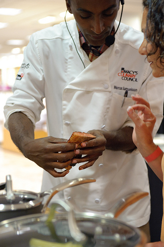 Thursday evening Lucy and I made the voyage (there’s really no other word for it) to North Point Mall for a cooking demonstration given by Marcus Samuelsson. In case your existence is as cable-free as mine, Chef Samuelsson recently won Bravo’s Top Chef competition. He was born in Ethiopia, grew up in Sweden, trained in France, traveled the world, and moved to the U.S. to raise our national standards and our self-esteem when it comes to our relationship with cuisine.