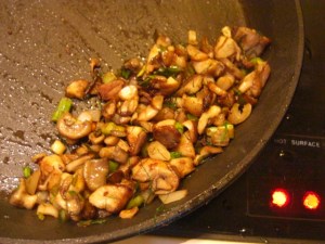 and then started all over again. A short time later, we sat down to pasta with sauteed mushrooms, green garlic, and onion now topped with browned butter.