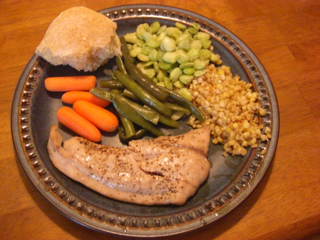 The fish was excellent, and the store frozen limas were fine. However, the green beans and corn were just okay – mere shadows of their former selves.