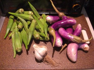 Last night I had an encounter with non-Asian eggplant. Even though I purged the slices, they still were gushy. I think it’s the diameter of the fruit. The fatter an eggplant, the larger the seedy parts. When I get a bite that’s mostly seedy parts, it makes me gag. So I’m happy to have this lovely, svelte Asian eggplant. I’ll broil some slices and maybe fry some, too.