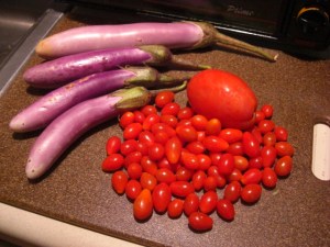 Is this summer’s last gasp? Seasonal produce changes lag seasonal weather changes a couple of weeks, so maybe we’ll get another week or two of summer veggies. I made Eggplant Parmesan earlier this week with a whole bunch of Asian eggplant. It was delicious, but what a lot of work! Too many steps for a lazy cook like me. This week’s eggplant will have to be something much simpler.
