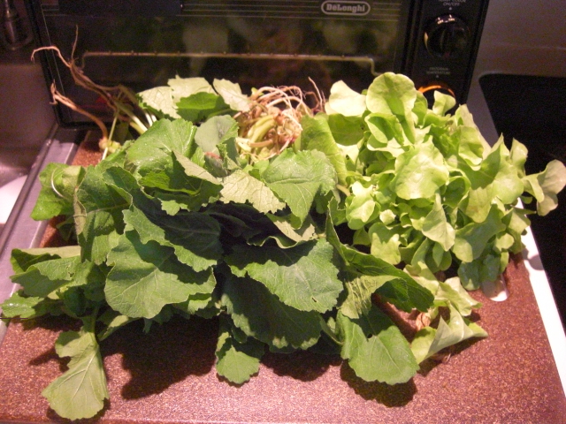 We’ll cook the greens with raisins and walnuts, and the lettuce has been washed and added to the salad spinner.