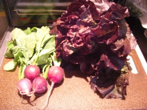 Well, here’s a no-brainer – lettuce and sliced radishes. Some of the radish greens looked nice, so I threw them in the crisper to cook with some older turnip greens.
