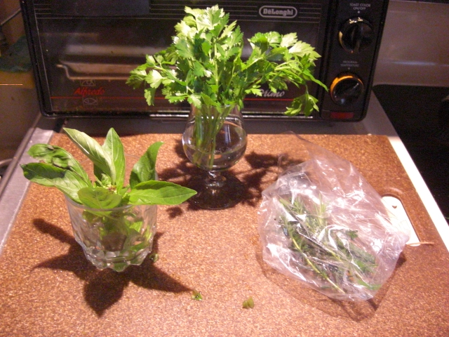 In the meantime, I’m storing the parsley and par-cel in a glass covered with a plastic bag in the fridge. The other herbs I just put back in the bag (after turning the bag inside out). I’ll keep an eye on them to make sure they don’t get all mushy before I can get to chicken-cooking.