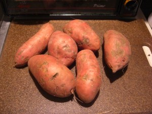 These specimens are real beauties: firm, heavy, with great color. I’ve been peeling, cubing, and roasting sweet potatoes lately because they’ve been small and uneven. These guys will be baked and proudly served in their skins.
