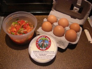 The bruschetta mix smells amazing – and a lot like pico de gallo. So instead of going Italian, we’re having quesadillas made with Fontina cheese and topped with the fresh mix and possibly some fromage blanc. The mix could also be heated and added to scrambled eggs for a very quick huevos rancheros dish. So many possibilities!