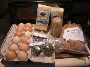 dozen eggs, 2 pounds of butter, a beeswax candle, whole wheat sourdough bread, chocolate mint, and lemon verbena