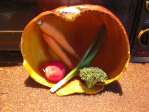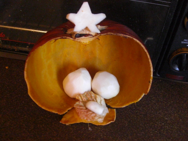 The pumpkin shell is oddly beautiful. I like the nativity scene. Collards are wonderful, bok choy or not.