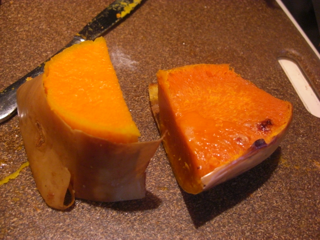 When the sweet potatoes were done, I took everyone out, chopped the squash into three pieces, and returned it to the oven in the hopes it would bake a little faster. It did, and after another half-hour, the peel just fell off,