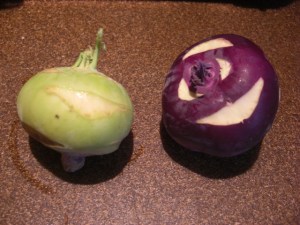 Kohlrabi is related to cabbage and definitely sports a cabbage-y flavor. Often kohlrabi comes with stems and leaves attached. You can sort of see a whole kohlrabi in this picture of a CSA delivery from May 2009.