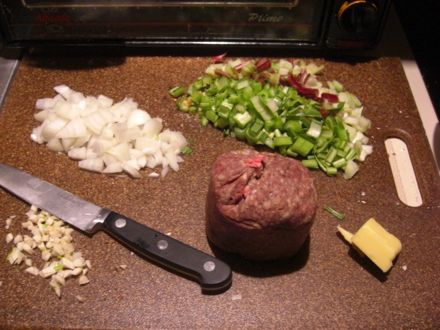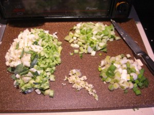 Casserole I: broccoli and cauliflower stems, pac choi stems, green onion, and garlic (not pictured: 1/3 pound of ground beef)