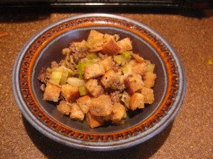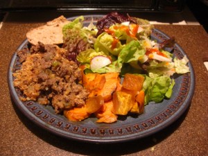 This dish is Chris’ favorite. If I have potatoes, I mash them and make cottage pie. Otherwise it’s just a casserole made of veggies and browned meat. First, they’re cooked in broth, Worcestershire sauce, and brown mustard plus whatever useful herbs might be lying around. Then, they’re topped with breadcrumbs and melted butter (or mashed potatoes for cottage pie) and baked at 400 degrees for about 45 minutes.