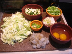 My Korean friend makes a “pancake” that you can put just about anything in. Typically it’s veggie and seafood bits sauteed and then covered in a thin, savory batter and fried up all together. Dip it in soy sauce or ponzu sauce and you’re good to go.