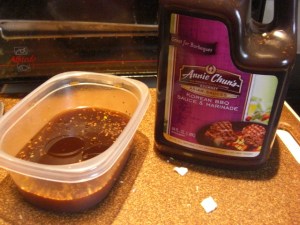 I got this jug of marinade on sale. I thought it was mostly soy sauce, but it's sweet enough to choke an 8-year-old. So I diluted it with chicken stock, sherry, and sesame oil. Pretty good after that.
