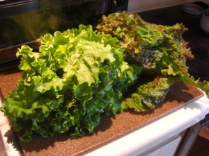 The lettuce on the left looked a little softer than the one on the right, so I washed and spun it first, and it’s waiting in the fridge. I would have mixed them, but my salad spinner’s too small.