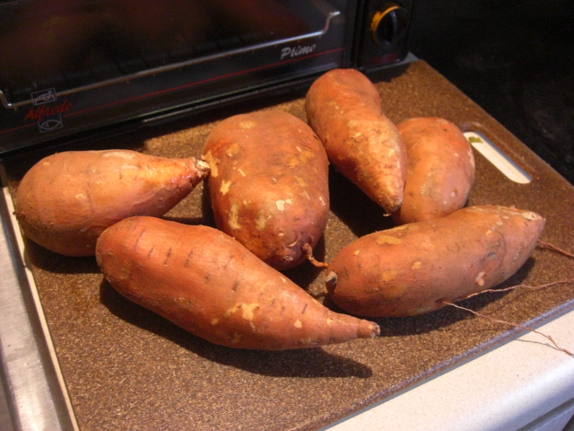 These sweet potatoes were a little damp from the box, but they’re drying nicely on the table. We’ll peel and cube these for roasted sweet potatoes. Yum!