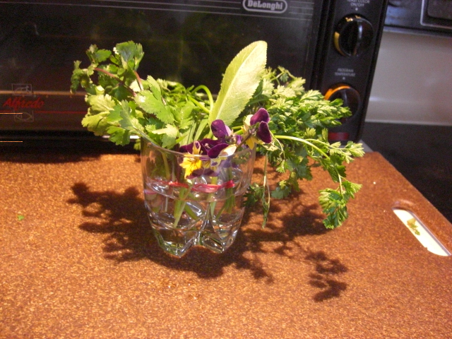 Johnny jump-ups are best for salad. (Unless you want to go crazy and candy them.) Because they don’t last long, I’ll try to use them tomorrow. In the meantime, I’ve lashed them together with a twisty-tie and put them along with the rest of the herbs in a glass of water.