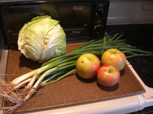 Green onions are good in salad and pretty much everything; we’re happy to have these. Green cabbage lasts so long that I can’t work up the energy to devise a plan for it yet. I’ll get around to it next week. I think we’re finally getting to the bottom of the barrel with last season’s apples. Mine are a little blemished. No real problem – I’ll just cut off the spots.
