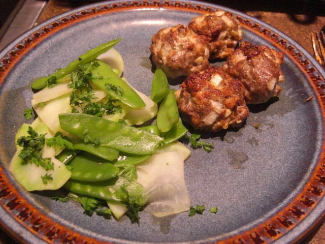 Wednesday supper was not pizza, alas. Instead we had sausage meatballs served with steamed snow peas, kohlrabi slices, and lovage and topped with chervil
