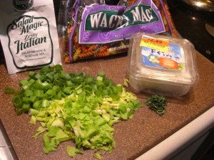 Cook and cool the pasta. Make the Italian dressing. Mix pasta, dressing, feta cheese, and green bits together.