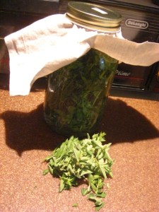 I had to cut off the tops of the oregano and savory to get them to fit in the jar. Those tips went in the tomato sauce, too.
