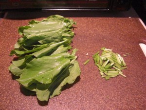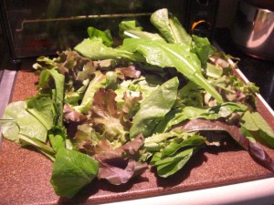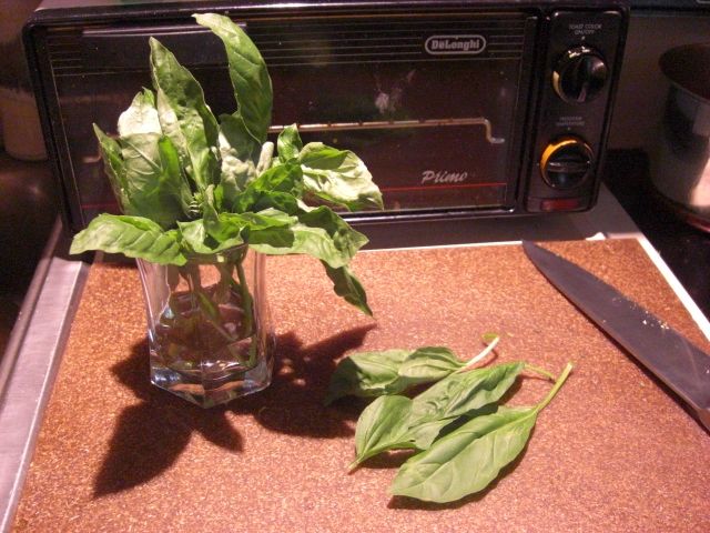 I put the parts with stems in water on the table (not in the fridge!), and they’ll last for a few days that way. The few stemless leaves I added to tomato sauce Wednesday night. (I don’t have a pic of that supper, but it was store-bought tomato sauce spiked with red wine and herbs served over spinach ravioli (from Sam’s via my freezer) along with a salad and the rest of the red wine.)