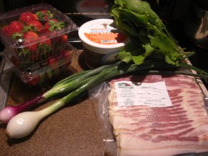 I adore this bacon and try to order it whenever it’s available. It’s amazing what a couple of slices of bacon will do to just about anything you can eat. Last night for a late supper, we had spinach and sorrel salads with bacon crumbles and green onions. So yummy!