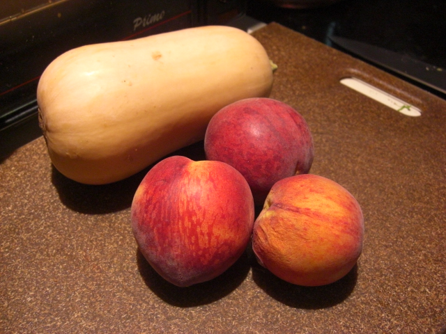 Chris and I are not fans of fresh peaches, but they do make delicious muffins. We are fans of butternut squash. I’ll let this little guy hang out and cure for a couple of weeks before cooking him. I’m not sure it’s necessary, but that’s what we did with a squash we got last month, and it was delicious.