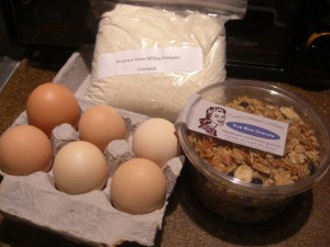 We also got some yummy granola with dried blueberries, some cornmeal, and our regular order of eggs.