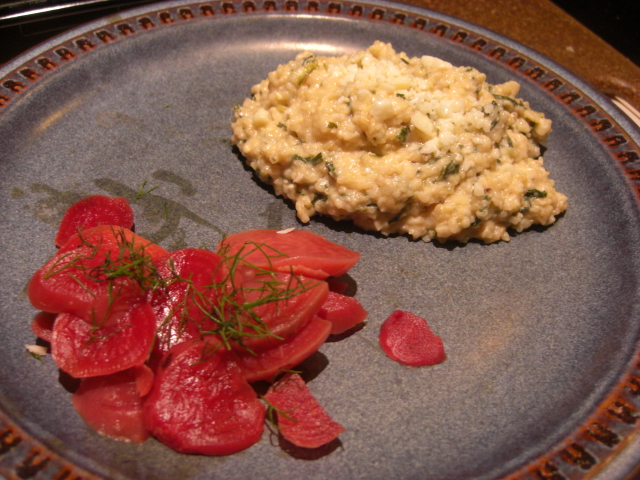 Along with some local goat cheese, these two make an awesome salad. I’ll roast the beets and chill them. Then I’ll slice them and add them to the arugula along with the cheese. No salad dressing required, although a sweetish vinaigrette applied with a light hand is nice.