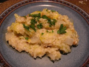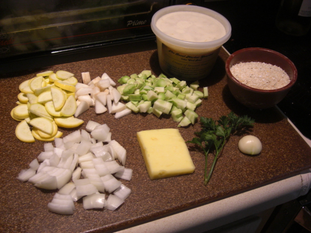 onion, yellow squash, Asian turnip, broccoli stems, cream of broccoli soup, grits, garlic, parsley, and butter (all local!)