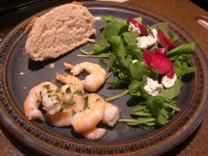 Not pictured is the olive oil and garlic I cooked the shrimp in that we saved for bread dunking. So good! And the next night, we poured the end of oil over the remainder of the goat cheese and spread that on the rest of the bread. Repurposed leftovers rule!