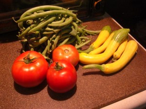The sliced tomatoes, squash, and green beans are great sides, but I think they need entrees. So I’m thinking I’ll make something with the ground beef and the spice mix or just sausage patties and grits. I cooked the green beans last night – in boiling water with a little olive oil and crushed garlic and then simmered them for about forty minutes. I don’t think there’s anything special (or difficult) about this recipe; the green beans are so flavorful – they just take care of themselves