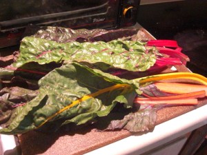 For the chard, I’ll separate the greens from their stems and sauté the greens in olive oil with raisins and chopped pecans. Then we’ll use whatever’s left of the stems for our traditional Tuesday clean-out-the-fridge stir-fry. In addition to chard stems, this week’s stir-fry will most likely sport half an Asian turnip, some garlic, onion, and probably a little yellow squash.