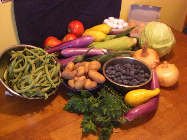 Here’s this week’s haul en masse (except for a cantalope that I forgot in the fridge). It was one heavy box of goodness!